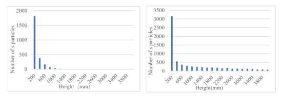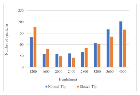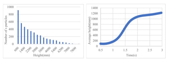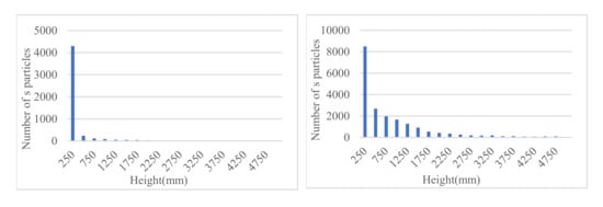 In the brownout phenomenon, the height of sand particles is related to the probability of dust collision with the fuselage or blade, and to the degree of wear and erosion of the blade surface. The height is also related to the visual field of the pilot in the cockpit. The height of particles from 0 mm to 4000 mm is counted; after this, every 200 mm is the interval. The particles leaving the ground (d > 200 mm) are analyzed separately, and the average height is counted. The results are shown in Figure 11 and Figure 12.
