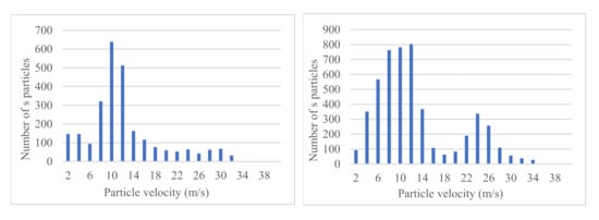 Just after the particles are entrained off the ground (t = 1 s), the velocity is mainly concentrated between 10 m/s and 14 m/s. The number of particles moving at a high speed is less, and the overall average velocity is not fast. With the passage of time, the average velocity of particles gradually increases. After 2 s, the number of high-speed particles gradually increases, and the number of particles with a velocity of about 25 m/s also increases, while the average velocity of the particles with the largest proportion begins to decrease. When t = 3 s, the trend is more obvious; some particles have a longer time to experience the acceleration of air flow, the proportion of particles with high-speed motion increases significantly, and the other particles will be affected by the air flow. The velocity begins to decrease after the particles suspend or sink to the bottom.