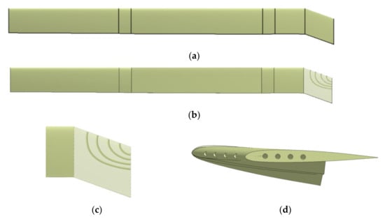 Slotted-tip rotor model. (a) The reference blade, (b) The slotted-Tip blade, (c) Local sketch of four circular slots, (d) The right view of blade tip.