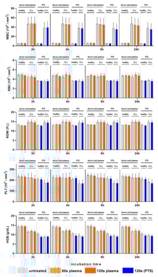 CBC parameters in CLL patient- and healthy volunteer-derived blood receiving either cold plasma (60 s or 120 s) or PTS (120 s) treatment, with subsequent analyses at 2 h, 4 h, 8 h, and 24 h. No significant difference was observed for any of the parameters between the control groups against either cold plasma treatment or PTS exposure in both healthy and CLL blood. Data are represented as mean + SEM of four donors each.