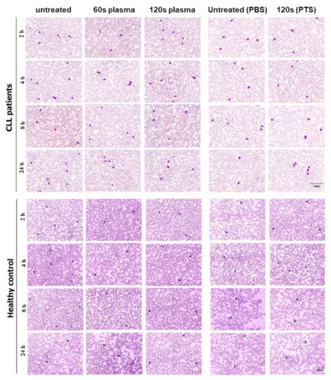 Morphological analysis of CLL patient- and healthy volunteer-derived blood receiving either cold plasma (60 s or 120 s) or PTS (120 s), with subsequent analyses at 2 h, 4 h, 8 h, and 24 h. No macroscopic difference was observed for the May-Grünwald staining between the control groups and either cold plasma treatment or PTS exposure in either healthy or CLL blood, as shown for one representative donor.