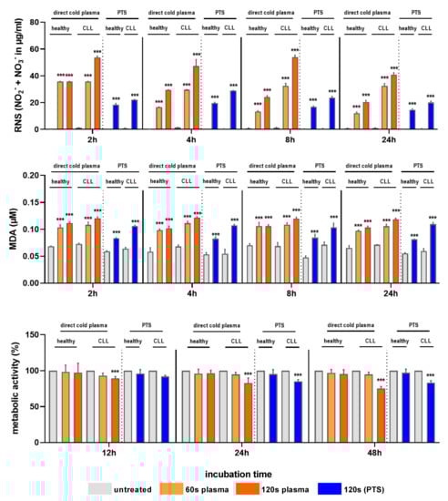 RNS (nitrite + nitrate) and MDA concentrations in CLL patient- and healthy volunteer-derived blood receiving either cold plasma (60 s or 120 s) or PTS (120 s), with subsequent analyses at 2 h, 4 h, 8 h, and 24 h, as well as metabolic activity of cultured leukocytes assessed at 12 h, 24 h, and 48 h after exposure. Data are represented as mean + SEM of three donors each; *** denotes p < 0.001.