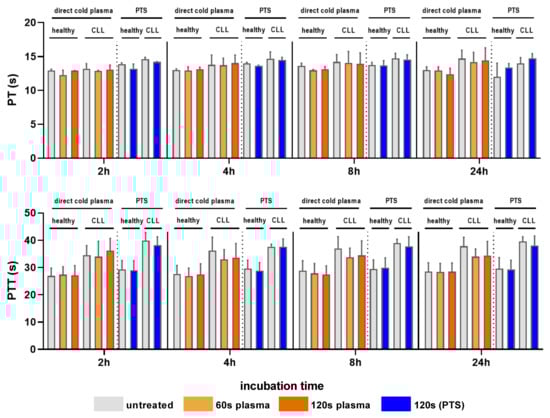 Hemostasis parameters. The median prothrombin time (PT) and partial thromboplastin time (PTT) in citrated blood plasma of patients with CLL and healthy volunteers were analyzed at 2 h, 4 h, 8 h, and 24 h after either cold plasmas (60 s or 120 s) or PTS (120 s) exposure. The results showed no significantly different results when comparing untreated to plasma groups. Data are represented as mean + SEM of four donors each.