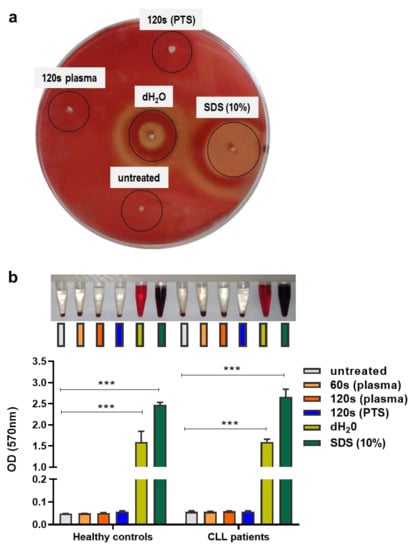 Investigation of hemolysis of RBCs isolated from CLL patients and healthy individuals after exposure to either cold plasma (60 s or 120 s) or PTS (120 s) after 24 h culture on agar plates (a). The quantitative spectrophotometric experiment was performed at 6 h (b). Deionized water (dH2O) and SDS 10% served as positive controls. Data are represented as mean + SEM of four donors each; *** denotes p < 0.001.