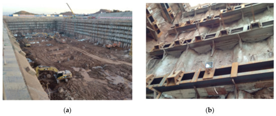 Construction site pictures: (a) excavation of foundation pit, (b) anchor cable and waist beam.