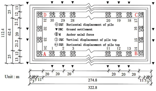 The monitoring data of horizontal displacement of the pile top, ground settlement, and horizontal displacement of the pile are analyzed from sections 14 and 34 of the pit corners, section 15 on the short side BC, section 33 on the short side CD, and sections 1 to 13 on the long side AB. Figure 3 illustrates the position of each monitoring site.