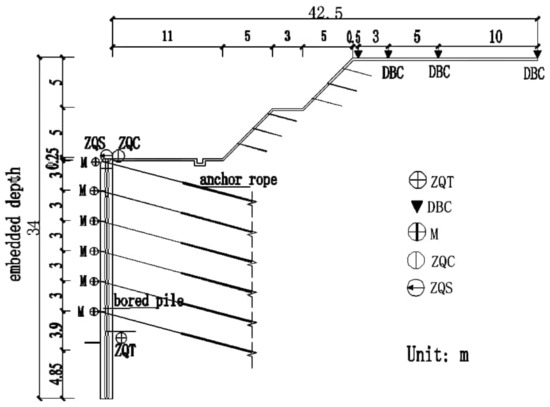 In the field, the pit was mainly monitored by instruments and supplemented by visual observation. A master survey section was set up each 20 m along the edge of the foundation pit, which had a total of 34 master survey sections. The top and body of the pile in the foundation pit were fitted with measurement points in each main section. The TOPCOM 7001 total station, Leica DNA03 precision level, and CX-08A inclinometer were used to monitor the horizontal displacement of the top of the pile, the vertical displacement of the top of the pile, and the horizontal displacement of the body of the pile. The above monitoring instruments are highly accurate and can measure up to 0.01 mm of the deformation, which can play a good role in measuring the deformation of the foundation pit. All anchor cables in each main survey section were equipped with force gauges to monitor the axial force of the anchor cables. Two rows of measurement points were arranged at the surface of each main survey section at the vertical pit edge, with each row of four measurement points spaced at 0.5 m, 3 m, 5 m and 10 m, to measure surface settlement using Leica DNA03 precision levels. At the edge of the foundation pit, monitoring posts were placed at 20 m intervals (in line with the main survey sections). While the top of the bored piles was being filled in each main survey section, prefabricated metal markers were placed and the horizontal displacement of the pile top was measured using a total station and the polar coordinate method. At the same time, a tilt pipe hooked directly to the bored pile’s reinforcing cage was used to monitor the pile’s horizontal displacement. Before the foundation pit was excavated, initial values were measured for each project. Monitoring occurred once every three days when the excavation depth was small. The frequency of monitoring increased as the depth of the excavation increased. Monitoring once or twice each day was required when the excavation depth surpassed 15 m. Figure 3 shows the location of each measurement point, and Figure 4 shows the arrangement of a typical monitoring section. In the figure, ZQT, DBC, M, ZQC, and ZQS represent the horizontal displacement at various depths, ground settlement, anchor cable internal force, vertical displacement of the pile top and horizontal displacement of the pile top, respectively.
