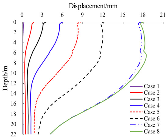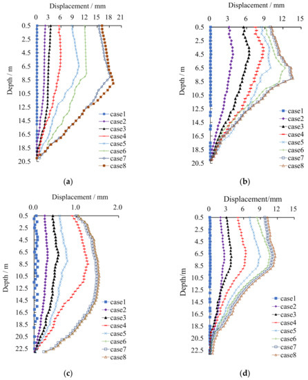 As can be seen from Figure 19, with the excavation and support of the pit, the horizontal displacement of the pile gradually increases, and the deformation tends to be stable at case 7. The shape of the deformation curve changed from “cantilever” to “belly drum”. The maximum value occurs between 6.0~8.0 m, which is about 1/3 of the length of the pile. In addition, it can be found that with the increase of the excavation depth, the difference of horizontal displacement of piles in adjacent cases keeps increasing, so the influence range of the spatial effect tends to increase with the increase of the excavation depth.