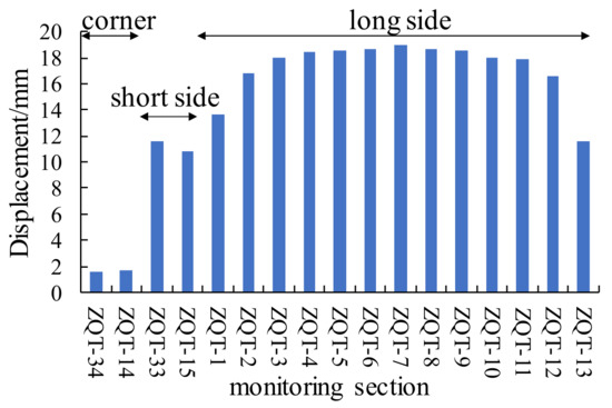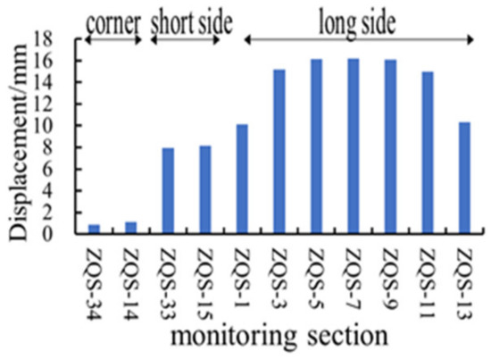 As shown in Figure 7, ZQS-7, which is the horizontal displacement of the pile top in the middle of the long side AB, is the largest (16.18 mm) and the pile top displacement decreases gradually from the middle to the sides of the foundation pit. ZQS-34 and ZQS-14, which are the horizontal displacements of the pile top of the pit corner, are small—1.03 mm and 1.11 mm, respectively. In addition, the horizontal displacements of ZQS-15 and ZQS-33 on the short side are 8.16 mm and 7.97 mm, which are both smaller than the value at ZQS-7 and larger than ZQS-34 and ZQS-14. The distribution of horizontal displacement of the pile top presents an obvious spatial effect.