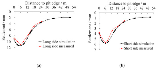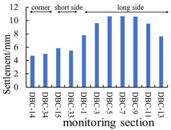 It can be seen from Figure 17b that the ground settlement is distributed along the long side with an obvious spatial effect, with the settlement at the pit corner being smaller than that at the middle. The ground settlement perpendicular to the pit edge also has a spatial effect as well: when approaching the middle of the pit, the ground settlement tends to grow at first and then subsequently diminishes.