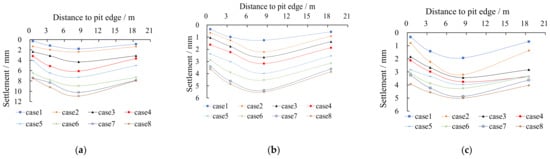 Distribution of ground settlement around pit under different case: (a) DBC-7, (b) DBC-33, (c) DBC-34.