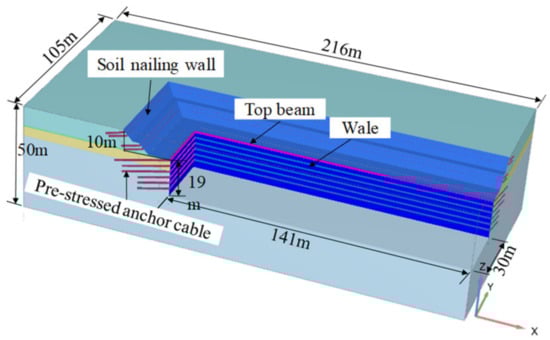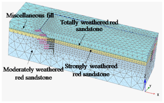 Due to the precipitation measures taken before construction, the influence of groundwater is not under consideration during the simulation process. The mesh is divided using a finite element mesh cell with 10-node tetrahedral cells. Boundary conditions of the model are established in accordance with actual circumstances. The four sides of the model have fixed constraints, the bottom of the model has fixed restrictions and the top surface of the model is free. Figure 11 represents the model’s three-dimensional mesh. The specific processes of slope excavation, soil nail wall construction, and shotcrete surfacing are not discussed in this paper.