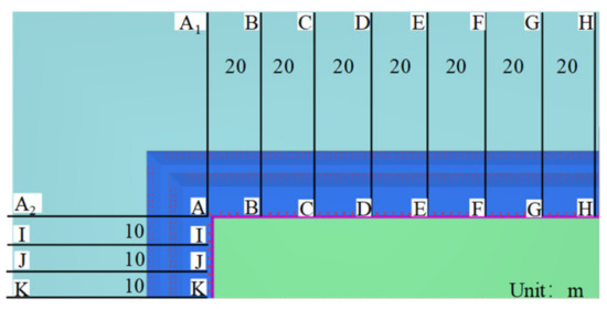 Several primary sections are chosen for analysis based on the monitoring sites, and properly characterize the 3D spatial stress and deformation of the foundation pit. The sections are shown in Figure 12. The HH section on the long side and the KK section on the short side of the foundation pit are selected to compare ground settlements, horizontal displacement of the pile’s top, and the horizontal displacement of piles at various depths. The results are shown in Figure 13, Figure 14 and Figure 15.