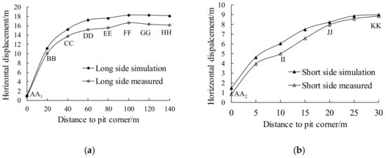 The deformation of the pile, as can be seen from Figure 17a, presents obvious spatial characteristics. The horizontal displacement of the pile at the foundation pit’s corner is the smallest. With the increase of the distance from the pit corner, the horizontal displacement of the pile gradually increases and reaches the maximum value at a certain distance from the corner. From sections AA1 to HH, the horizontal displacement curve of the pile changes from “bow” to “belly drum”. Moreover, the curve shape keeps the same “bow” from sections AA2 to KK.