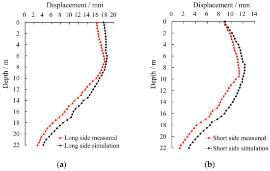 Figure 14 shows that the horizontal displacement of the pile top at the pit corner is obviously less than that at the middle, no matter the measured value or the simulated value. Although the simulated values are slightly larger than the measured values, the deformation trends are consistent. The result illustrates that the spatial effect of pit deformation through the 3D simulation is correct.