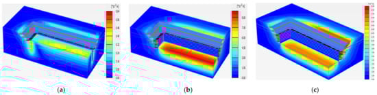 As shown in Figure 5, the maximum horizontal displacements at ZQT-7, ZQT-1, ZQT-34, and ZQT-33 are 17.93 mm, 13.63 mm, 1.54 mm, and 11.63 mm, respectively. After case 1 was completed, the pile’s horizontal displacement at different depths was modest. With the excavation of earthwork, the horizontal displacement of the pile increased steadily, peaking at 1/3 to 1/2 of the pile. The horizontal displacement curve of the pile was small at both ends and large in the middle. Similarly, the spatial effect of horizontal displacement of the pile is obvious, which is shown in Figure 6. The maximum horizontal displacement at ZQT-7 is the largest, followed by ZQT-15, and the smallest at ZQT-14 and ZQT-34. At the corner of the pit, the support structure is constrained by two directions simultaneously, which restrains the development of displacement and force in the area near the pit corner and effectively decreases the deformation of the support structure.