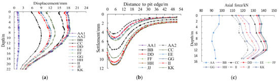 Simulation results of different sections: (a) Horizontal displacement of piles, (b) Ground settlement, (c) Axial force.