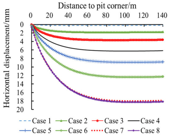 As can be seen from Figure 18, the horizontal displacement of the pile top gradually increases from the pit corner to the middle of the long side and remains stable at a certain distance from the pit corner. With excavation cases from 1 to 8, the spatial effect influence range is 3 m, 19 m, 35 m, 48 m, 60 m, 78 m, 92 m, and 92 m, respectively. With the increase of excavation depth, the influence of spatial effect also increases, and the scope of influence is 0~92 m, which is about five times the excavation depth. Beyond this scope, the displacement is almost unchanged. The short side of the pit in this project is greatly affected by the spatial effect. Within 98 m in the middle of the direction of the long side, it is less affected. In this case, it can be calculated according to the two-dimensional strain method.