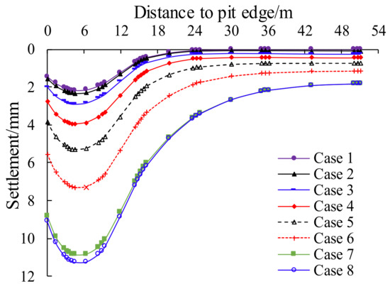 When the piles in the pit are deformed, the soil around the pit is displaced by the active earth pressure, which will fill the space formed by the deformation of the piles and cause the settlement of the ground outside the pit. As the pile deformation in the middle of the pit is greater than the deformation in the corner of the pit, the ground settlement appears similar in nature, with the ground settlement near the middle of the pit being greater than the ground settlement near the corner of the pit, the same as the results in Figure 8.