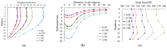 As can be seen from Figure 21, the change of the elastic modulus has a certain degree of influence on the horizontal displacement of the pile, ground settlement and axial force, but the curve forms all stay the same under each case. When the elastic modulus is 0.5 E, 0.75 E, 1.0 E, 1.5 E, and 2.0 E, maximum horizontal displacements of piles are 33.86 mm, 24.27 mm, 18.44 mm, 12.53 mm, and 9.87 mm, respectively. When the elastic modulus increases from 0.5 E to 1.0 E and then from 1.0 E to 2.0 E, the maximum displacement of the pile was reduced by 83.6% and 53.8%, respectively. The change in elastic modulus has little effect on the extent of ground settlement around the foundation pit. When the elastic modulus increases from 1.0 E to 1.5 E and then from 1.5 E to 2.0 E, the maximum settlement decreases by 46.8% and 21.2%, respectively. When the elastic modulus increases from 1.0 E to 2.0 E, the maximum axial force decreases from 142.43 kN to 120.65 kN, decreasing by 15.3%.