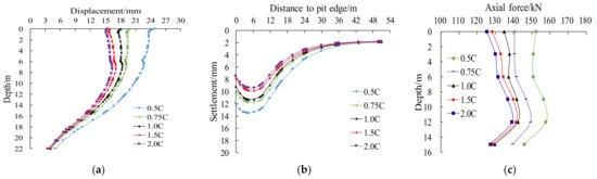 As can be seen from Figure 22, when the cohesion decreases from 2.0 c to 0.5 c, the changing trend of horizontal displacement of the pile, settlement, and axial force are similar to the change of elastic modulus from 2.0 E to 0.5 E. The shape of the curve is basically unchanged. When the cohesion increased from 1.0 c to 2.0 c, the maximum values of horizontal displacement, settlement and axial force decreased by 10.8%, 16.7%, and 2.3%, respectively.