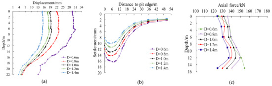 Influence curves of different pile diameters: (a) Horizontal displacement of piles, (b) Ground settlement, (c) Axial force.