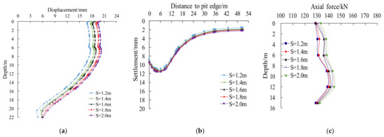 Influence curve of different pile spacing: (a) Horizontal displacement of piles, (b) Ground settlement, (c) Axial force.