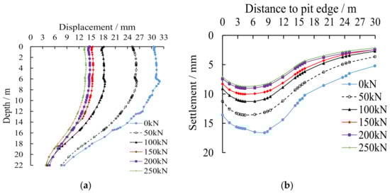 Influence curves of different prestress: (a) Horizontal displacement of piles, (b) Ground settlement.