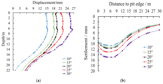 Influence curves of different tilt angle: (a) Horizontal displacement of piles, (b) Ground settlement.