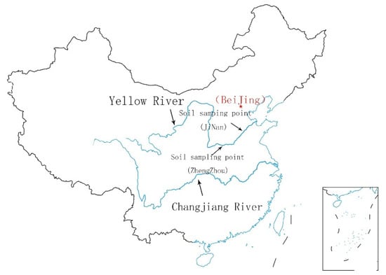 The soil used in the experiment was taken from the floodplain area of the middle and lower reaches of the Yellow River (Zhengzhou and Jinan, China), as shown in Figure 1. According to the particle size larger than 0.075 mm, using the sieving method, and less than 0.075 mm using the hydrometer method to carry out particle separation test on the soil in the two areas, the particle grading curve of the two is shown in Figure 2, in which the fine particle content of the soil in Zhengzhou area is 75%, and the fine particle content of the soil in Jinan area is 47%. In order to obtain the soil with fine particle content between the two areas, the Zhengzhou soil and Jinan soil were mixed in a ratio of 3:7, and the fine particle content of the mixed silt was 63%. As can be seen from the specification, the soil whose particle size is less than 0.075 mm and the mass of the fine-grained group is greater than or equal to 50% of the total mass in the sample is called fine-grained soil (GBJ 145-90), so the three kinds of soil are all fine-grained soil. The liquid limit, plastic limit and plastic index of the three kinds of soil were measured by the combined liquid plastic limit instrument, as shown in Table 1. The three kinds of fine-grained soil were further subdivided according to the plastic diagram (liquid limit 17 mm), and all of them were low-liquid limit silt soil.