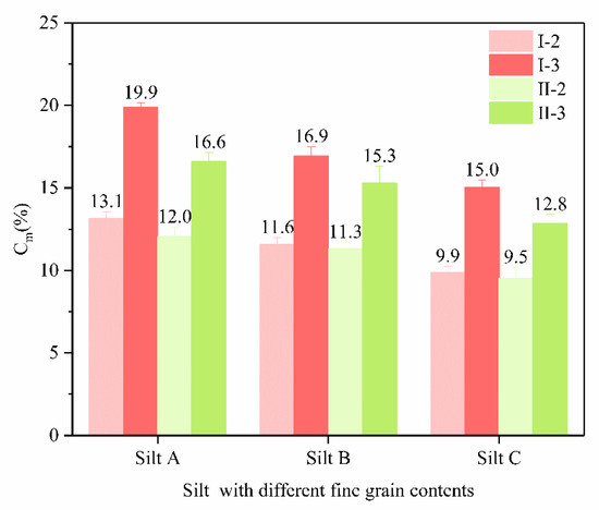 As can be seen from Figure 11, in the case of the same fine particle content, the unconfined compressive strength of silt with a pore ratio of 0.75 is slightly higher than that of silt with a pore ratio of 0.9 of the same type. When the pore ratio is 0.75, the pore volume of silt sample is small and large. When the microbe induced calcium carbonate precipitation technique was applied to the sample, the number of bacteria in the pores of the samples increased, which increased the nucleation site of calcium carbonate when the cementing solution was injected, and the content of calcium carbonate increased correspondingly and the strength increased. When the pore ratio is 0.9, the pore volume of the silt sample is too large, and the bacterial liquid and the cementing liquid are not easily retained in the sample during the grouting process, resulting in the reduction in calcium carbonate production and strength. By comparing the amount of calcium carbonate in sand and residual soil samples, Soon et al. [13] found that soil particle size had a significant effect on the amount of calcium carbonate. The calcium carbonate content of the treated sand samples is generally higher than that of the residual soil samples, but the improvement effect of microbial-induced calcium carbonate precipitation on the shear strength of the residual soil is better than that of the sand, and the increase in the shear strength of the residual soil increases with the increase in density.