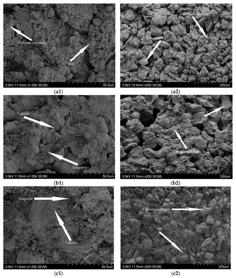 SEM images of different silts. (a1,a2) SEM image of silt A; (b1,b2) SEM image of silt B; (c1,c2) SEM image of silt C.