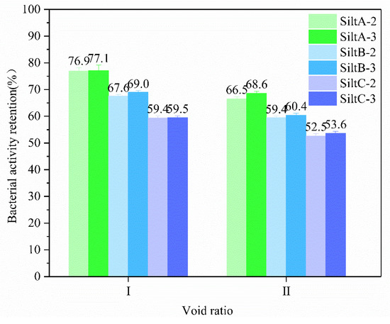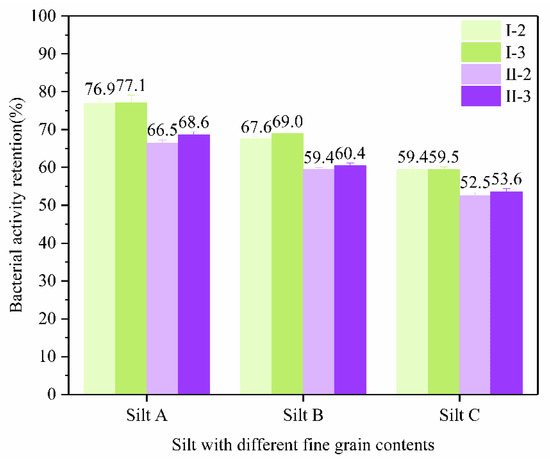 As can be seen from Figure 8, when the pore ratio was 0.9, the capacity of residual bacteria decreased by about 10% compared with that of the same type when the pore ratio was 0.75. When the pore ratio was 0.75, the retention capacity of bacteria was between 60% and 80%, which indicated that more than half of the bacteria remained in the silt during the first injection of bacterial liquid. The higher the retention capacity of bacteria, the more Bacillus pasteurii octahedrin used for catalyzing urea hydrolysis. In the process of grouting, the bacteria liquid is usually injected first and then the cement liquid is injected. For the controls, similar to the findings of Harkes et al. [19], more than 70% of bacterial activity could not be retained. The retention capacity of bacteria is related to the bacterial suspension OD600 that flows out during the first round of grouting, and has nothing to do with the injection amount of cement liquid. Therefore, there is little difference between OD600 when the injection amount of cement liquid is 150 mL and 300 mL. As can be seen from Figure 9, in the case of the same pore ratio, the capacity of silt retention bacteria increases with the increase in fine particle content, which is also related to the adsorption of fine particles. It can be seen from the figure that silt A with pore ratio of 0.75 and fine particle content of 75% has the highest bacteria retention capacity, which is 77%.