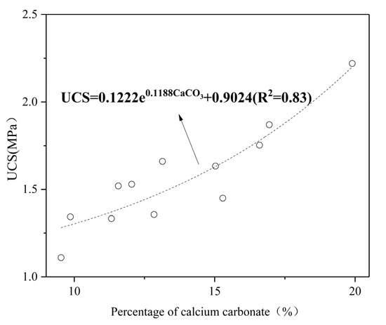 Relationship between the content of calcium carbonate and unconfined compressive strength.