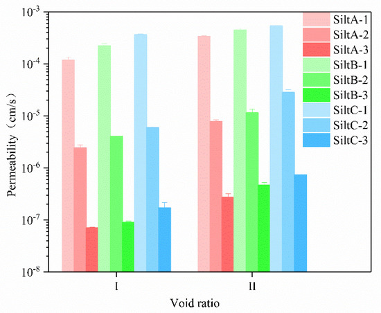 As can be seen from Figure 14 and Figure 15, after curing by microorganism, the permeability coefficient of Silt A with pore ratio of 0.75 and fine particle content of 75% is 7.08 × 10−8 cm/s, while that of the same type of untreated silt is 1.18 × 10−4 cm/s, which decreases by 4 orders of magnitude. This indicates that calcium carbonate precipitation induced by microorganisms technology can significantly improve the permeability coefficient of silt, making it nearly impervious to water. It can be seen from the figure that, when the injection amount of single round cementing fluid is 150 mL, the permeability coefficient of silt has decreased significantly compared with that of untreated silt, and when the injection amount of cementing fluid continues to increase, the permeability coefficient can still decrease by 1~2 orders of magnitude.