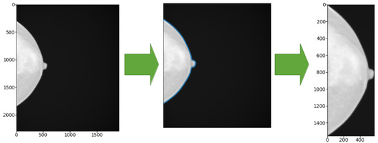 The GE Senograph mammograms are 1914 × 2294 pixel images, where the breast representation often occupies about half of the image width. To limit the data processing time (i.e., to minimize the number of input nodes of the CNN and thus the weights to be learned during the training process) we decided to crop the images according to the minimum bounding box enclosing the breast view. To this purpose, we attempted to recognize the skin line of the breast using a marching-square algorithm for 2D images [24,25], available within the scikit-learn Python package [26]. To properly identify the breast margin, we set the starting threshold at the intensity level of 50 while leaving the other parameters to default values; then we cropped the images to the minimum bounding box including the margin, as shown in Figure 1.