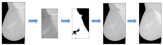 As an additional pre-processing step, we designed an algorithm to remove the pectoral muscle that appears on medio-lateral oblique projections. First, all the medio-lateral oblique projections have been oriented in the same way, i.e., left ones have been flipped horizontally. Then we chose a square which contains the pectoral muscle and cropped the image. A Gaussian filter has been applied to all the selected regions in order to reduce noise. For each image, the regions have been binarized with an adaptive threshold method based on inverted binary thresholding and Otsu’s binarization and the mask containing the pectoral muscle (white) and the rest of the breast (black) have been produced. The coordinates of the points at the edge of the pectoral muscle have been fitted with a linear function and the values of all the pixels above the edge have been replaced with the mean gray level of the breast. In Figure 2, we reported an example of these operations.