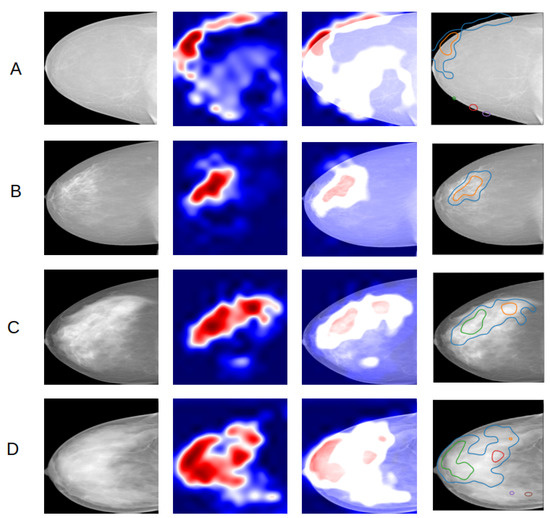 Comparison of heatmaps of the four density classes (A–D) with one example per class, obtained from a CNN trained on right CC projections. From left to right, the input image, the grad-CAM, the overlay of the map on the input image, the overlay of edges of red activated areas in the map on the input image.