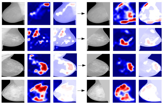 Grad-CAM maps have been generated in the two cases and they have been compared. In most cases, muscle removal helps in guiding the network to focus on the right breast area and after segmentation the pixels forming part of the muscle are no longer highlighted and activated (Figure 6). Therefore, segmentation and removal of pectoral muscle in the image pre-processing phase help in the performance improvement.