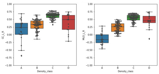 From a visual inspection of a number of examples, including those shown in Figure 6, it seems that to predict the breast density category the CNN is actually “looking” at the appropriate image information, namely the higher-intensity regions of the mammograms. A possibility could be to quantitatively compare the area of the saliency map over a predefined threshold and a hand-crafted pixel-wise ground truth for dense areas generated by a radiologist. That would be an extremely time-consuming task; thus, we discarded this option and proposed a straightforward method to evaluate whether the maps and the higher-density breast areas are spatially correlated. Moreover, for this classification task it is not fair to use pixel wise ground truth since the class assessment by physicians is made by observing the entire image and not pixel wise. It is apparent from a visual inspection of a number of examples, including those shown in Figure 6, that to predict the breast density category the CNN actually relies on an intelligible and appropriate image information, namely the higher-intensity regions of the mammograms. To quantify the extent of this hypothesized direct relationship, we computed the Spearman’s rank correlation coefficient r between the grey-scale image and the grad-CAM map converted into a grey-scale image. The box plots obtained for the correctly classified mammograms in the test set of the four density categories are shown in Figure 7 separately for the CC and MLO projections.