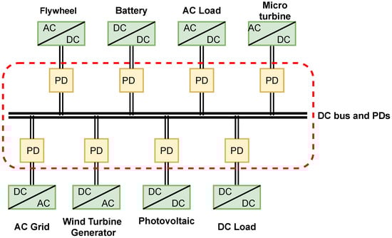 A DCMG is defined as a MG in which the power interchange is given in the DC bus [,]. A DCMG may be powered from AC sources, although these sources must be connected to the DCMG through AC to DC interfaces (power inverters) []. Figure 1 shows a conceptual diagram of a DCMG with the location of the protection devices (PDs) that are covered in this document.