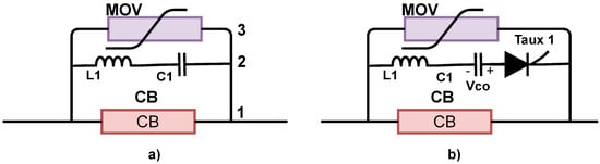 Figure 3a shows a MCB with passive commutation. Its components are: (1) the branch of the switch, (2) branch of the series resonant circuit, and (3) branch of the energy-absorbing circuit. In the case of active switching, the capacitor has already been pre-charged, and when the switch opens, the capacitor injects a negative current equal to the fault current to make a zero crossing of the current. During the interruption process, the magnetic energy is stored in the inductor and the varistors are connected in parallel with the switch to mitigate the over-voltage and absorb the energy stored in the inductor. Figure 3b shows the mechanical switch with active current switching.