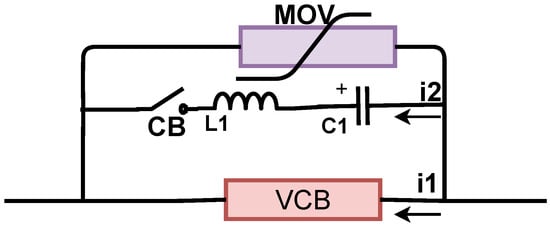 In the VCB, once the contacts are separated, the arc current generated across the electrodes is extinguished using a vacuum chamber so that a vacuum arc is initiated at the contacts. This arc is then extinguished and the conductive metal vapor condenses on the metal faces, and the dielectric strength in the electrode is reduced. VCBs feature arc voltages lower than 100 V, and they do not limit the arc currents of MVDC MG. VCBs are effective because they avoid re-ignition of the arc after zero current []. The most frequently used approach of VCBs in MVDC interruption is based on artificial current zero (ACZ). Figure 4 depicts a general circuit of an ACZ-VCB. The interruption process begins with the separation of the VCB followed by the formation of a vacuum arc conducting line current i1. As the electrode gap of VCB reaches a certain safe stroke to withstand the recovery voltage, the commutation circuit breaker (CB) injects a high-frequency oscillating commutation current i2, which is generated by discharging a pre-charged commutation capacitor C1 through inductance L1. In consequence, the superimposition of i2 forces i1 to drop to zero. Then, VCBs can be interrupted by extinguishing the vacuum arc. A metal oxide arrester is used to suppress the over-voltage across the VCB [].