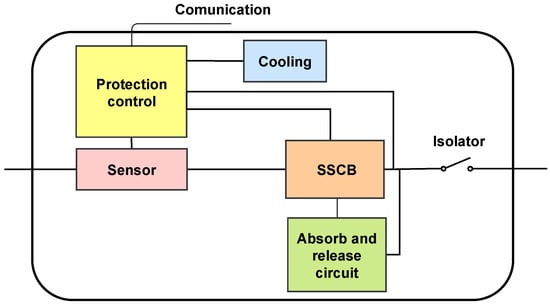 SSCBs can be damaged due to overvoltage of the inductive components of the system, hence the importance of reducing this voltage for the safety of the device. To protect the solid-state switch from overvoltage at the moment of opening, additional elements are required, such as resistors, capacitors, diode (RCD) Snubber Circuits, metal oxide varistors (MOV), and freewheeling diodes [,]. In the Ref. [], the authors described the advantages and disadvantages of different SSCB snubbers: the metal oxide varistor (MOV), single snubber capacitor, dissipative snubber, RC snubber, and RCD snubber. They concluded that RCD snubber is the best option and is able to avoid the oscillation between C and L by using a fast recovery diode to clamp the changing voltage; it is, therefore, a suitable candidate for medium-capacity applications []. The protection control, heat cooling system, sensor, and damping system for a SSCB are depicted in Figure 5.