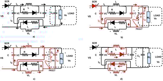 Z-source circuit breakers (ZSCBs) constitute one of the most recent lines of research and development of circuit breakers for over-current faults in DCMGs. ZSCBs feature natural switching, automatic disconnection of the fault load, simple control circuit, isolation of the fault source, and inherent coordination capacity. Furthermore, the ZSCBs’ impedance fault limits the fault current and can operate in bidirectional mode. The ZSCBs can take the transient current that occurs at the fault and pass it through the ZSCB capacitor so that the semiconductor-controlled rectifier (SCR) is disconnected. Figure 7 illustrates the states through which the ZSCB switch passes in the event of a fault []. The operating states are described as follows: In the steady state, the current passes through the inductor to the load, since the inductor behaves as a short circuit, and the capacitors as an open circuit (Figure 7a). Once the fault occurs, the current passes through the capacitors of the ZSCB to disconnect the SCR naturally. In this state, the capacitor currents increase and cause the SCR to switch, disconnecting the fault source, and a control circuit removes the SCR gate voltage before the SCR voltage becomes negative (Figure 7b). In the next state, two series LC circuits are connected to the fault and the load, initiating a resonance until the inductor voltage becomes negative (Figure 7c). Then, the third state begins, in which the diodes and resistors conduct until the current decays to zero (Figure 7d) [].