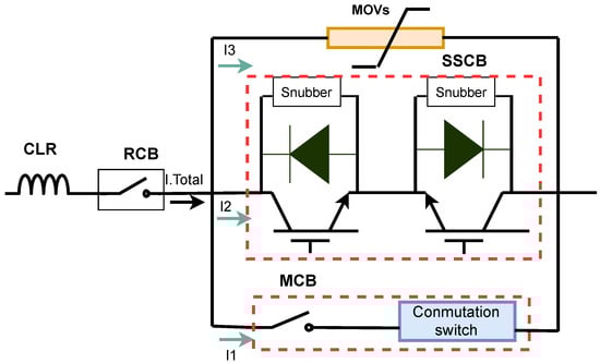 HCBs are a combination of the best features of MCBs and SSCBs in a single device, overcoming the drawbacks of both devices. HCBs have small conduction losses, very short operation times, long life, high reliability, and do not require special cooling equipment. Additionally, they feature simpler control, and more compact volume [], resulting in a new direction of research and development of switches for engineering applications. Figure 8 illustrates the current path in the different states for HSBs—in normal condition, the current passes through MCB. When a fault is identified, the MCB starts the opening of its contacts and sends a turn-on signal to the SSCB. The established arc voltage is increased until it exceeds the voltage drop of the SSCB. In this case, the current can be naturally commutated from the MCB to the SSCB. The SSCB continues conducting current until the MCB is able to block the full voltage. At this point, the SSCB is turned off and the voltage increases quickly because of the circuit inductors. While the voltage reaches its breakdown value, the fault current commutes to the MOV to clamp voltage and approach the current to zero. Finally, when the fault current is zero, the RCB is opened to isolate the faulty line from the DC grid to protect the MOV from thermal overload []. Moreover, a current-limiting reactor (CLR) in series with a residual circuit breaker (RCB) was added to limit the rate of rise of currents and to provide complete galvanic isolation.