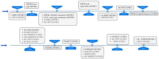 This section has the purpose of showing the DC CB evolution. DC CBs have been evolving for more that 100 years. For this reason, the time-line is divided after and before the definition of DCMGs. Figure 9 corresponds to the evolution of DC CBs before the emergence of DCMGs, while Figure 10 illustrates the evolution of DC CBs after the emergence of DCMGs.