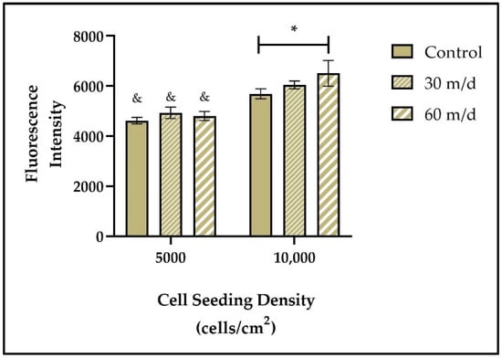 Alamar Blue metabolic activity assay results for Y201 cells seeded at 5000, or 10,000 cells/cm2 on day 5 in either unstimulated (control) conditions, or under ES of 30 or 60 min per day (m/d). * p < 0.05 versus unstimulated control cells seeded at 10,000 cells/cm2; & p < 0.05 versus all three 10,000 cells/cm2 groups. N = 3 for controls, and N = 5 for ES groups. Statistical analysis performed by a two-way ANOVA, and Tukey’s multiple comparisons test.