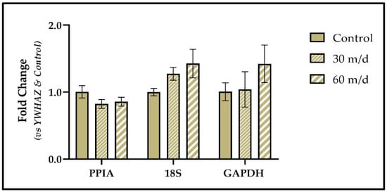 As previously mentioned in Results Section 3.2, an immortalized human MSC line was used in this study. A question we posed was if the findings were also consistent in primary human MSCs, that still retain replicative senescence and are of a different donor. Therefore, we assessed the expression of YWHAZ versus PPIA in primary human bone marrow-derived MSCs (Figure 6). We found no change in the gene expression after 30 or 60 m/d of ES; therefore, YWHAZ and PPIA were also stable with increasing duration of ES in primary MSCs as well as the Y201 MSC line. This shows that the human immortalized cells used in this study are a highly relevant MSC line, with transferrable results.