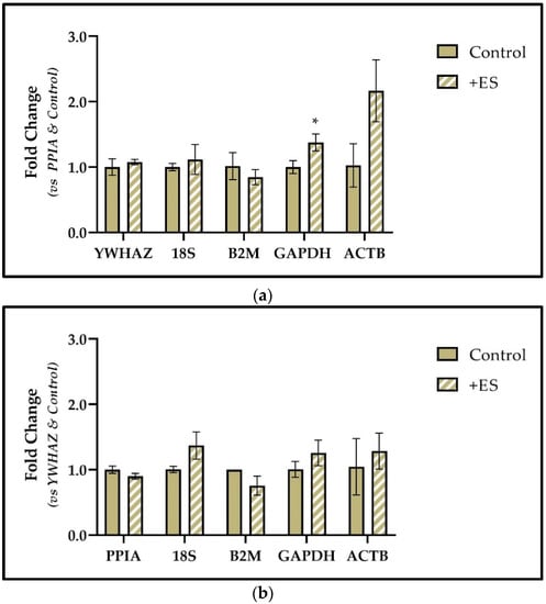 In contrast, YWHAZ, 18S, and B2M did not show any significant differences in the ES groups versus PPIA and the control cells (Figure 5a). At the seeding density of 10,000 cells/cm2, the expression of none of the potential reference genes were significantly altered following ES (Figure 5b). However, the most consistent pair were PPIA and YWHAZ, with an average fold change in the ES group of 1.08 and 0.90 respectively (Figure 5a,b).